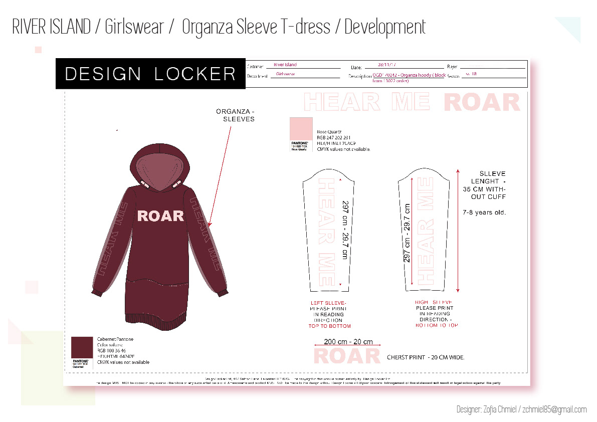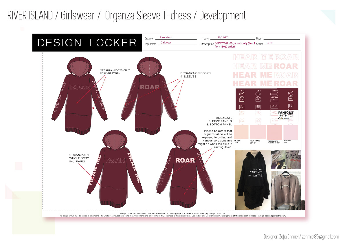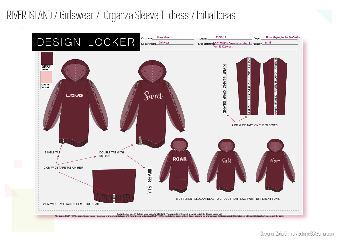 This page shows the development of Grirslwear T-dress from clients brief to the first sample made in house. I have designed the whole graphic on the garment and took care of sampling screen-printed graphics.